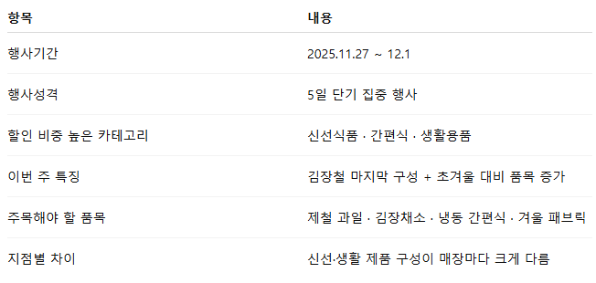이번 주는 초겨울 장보기·김장철 마지막 수요·간편식 증가·생활용품 수요가 동시에 나타나는 시기라 전단 구성 폭이 넓게 형성됩니다. 특히 신선식품과 김장 관련 품목 비중이 크게 나타나는 주간이라 필요한 품목을 빠르게 정리해보는 것이 좋습니다.