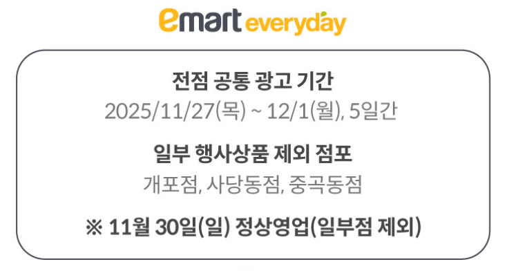 이마트 에브리데이 전단행사는 2025년 11월 27일(목)부터 12월 1일(월)까지 5일간 운영되는 단기 행사입니다.