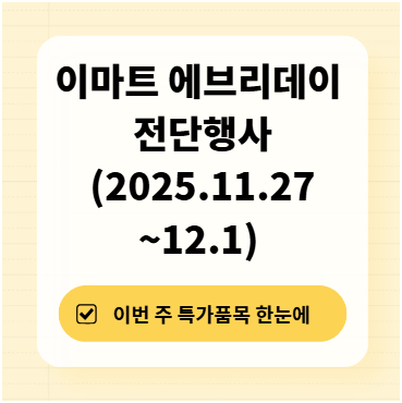 이마트 에브리데이 전단행사(2025.11.27~12.1)는 단기 집중 행사로, 신선식품·김장철·냉동 간편식·생활/겨울 대비용 품목 비중이 크게 구성된 주간입니다. 이번 주는 김장 마무리 시점과 초겨울 대비 수요가 동시에 나타나는 만큼, 전단 핵심 카테고리를 중심으로 장보기를 계획하는 것이 효율적입니다. 전단은 공식 페이지에서 지점 선택 후 확인할 수 있으며, 지점별 구성 차이가 크다는 점만 기억하면 됩니다.