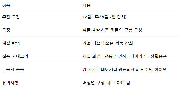 초겨울에는 간편 조리 제품의 수요가 증가하며 냉동피자, 냉동튀김류, 간편 세트류 등 재고 회전이 빠른 품목들이 주간 구성에 포함되는 경우가 많습니다. 즉석국류와 라면류 같은 간편 조리 식품 비중도 커지는 시기입니다.