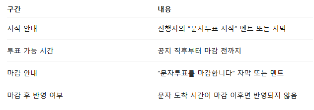 투표가 가능한 시간은 투표 오픈 공지가 방송 화면에 등장한 시점부터 마감 멘트가 나오기 전까지입니다.