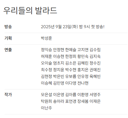 우리들의 발라드는 2025년 12월 2일 방송된 최종회를 끝으로 시즌이 마무리되었습니다.