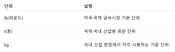 구리는 국제 시장에서 파운드(lb) 또는 톤(t)을 기준으로 발표되지만, 국내에서는 kg 단위가 활용되는 경우가 많습니다.