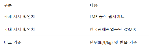 국제 시세(LME 기준)를 단위와 함께 확인