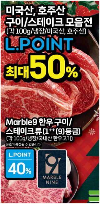 미국산·호주산 구이용 고기와 스테이크류, 한우 구이류가 중심에 배치되어 있으며, 크리스마스와 연말 가족 식사를 겨냥한 구성임이 분명합니다. 평소 전단보다 ‘구이·파티용’ 품목이 전면에 배치된 것이 특징입니다.