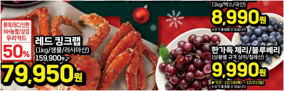 레드킹크랩과 같은 고가 수산물이 전단에 포함된 점도 연말 전단의 특징입니다. 이는 일상 소비보다는 특정 시점 소비를 전제로 한 상징적 구성으로 볼 수 있습니다.