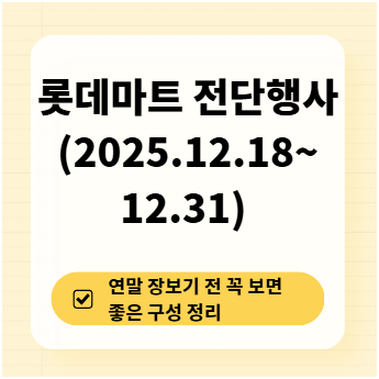 롯데마트는 2025년 12월 18일부터 12월 31일까지 연말 전단행사를 진행합니다. 이번 전단은 크리스마스를 앞둔 시점부터 연말까지 이어지는 기간으로, 평소보다 연말 식탁과 모임 수요를 직접 겨냥한 구성이 두드러집니다. 특히 축산·과일·간편식·파티용 상품 비중이 높게 배치되어, ‘연말용 전단’이라는 성격이 명확하게 드러납니다. 이번 글에서는 실제 전단을 기준으로, 이번 기간 롯데마트 전단의 구성 특징과 소비 포인트를 정리합니다.