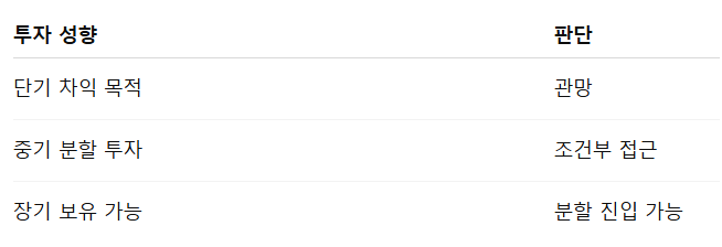 최고가 이후의 투자는 전망보다 자신의 투자 기간과 대응 능력을 기준으로 판단하는 것이 가장 현실적인 접근입니다.