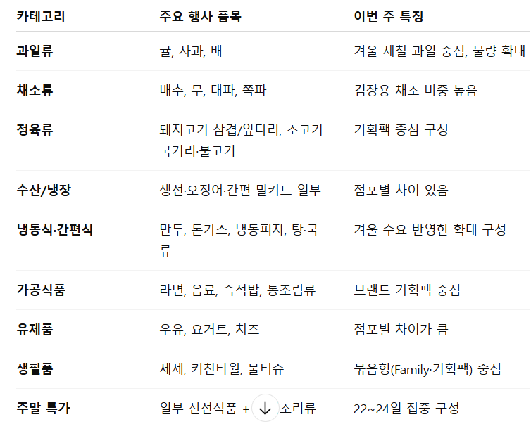 소비자가 가장 궁금해하는 ‘어떤 품목이 행사인지’를 중심으로 정리했습니다.