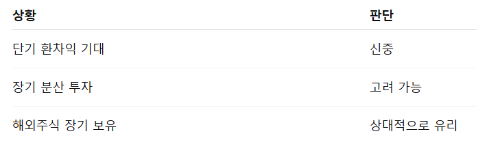 환율이 고점 대비 내려왔기 때문에 “싸졌다”고 느끼기 쉽습니다. 하지만 다음과 같은 경우에는 달러 매수가 오히려 불리해질 수 있습니다.