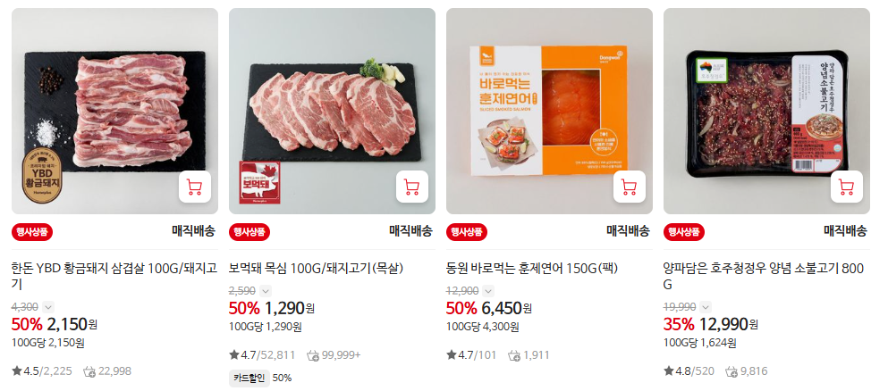 - 양념육 대방출: 요리가 번거로우신 분들을 위해 소불고기, 제육볶음 등 양념육 2팩 구매 시 1만 원 할인 행사를 병행합니다.