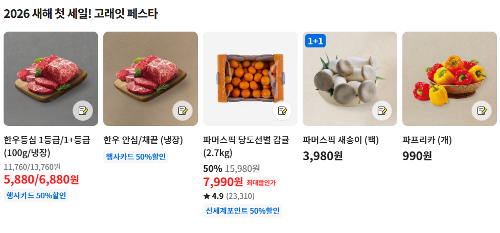 - 제철 딸기 전 품목: 현재 가장 맛있는 과일인 딸기는 행사카드 전액 결제 시 20% 할인이 적용됩니다. 설향부터 금실, 장희 딸기까지 다양한 품종이 준비되어 있으니 취향껏 고르시면 됩니다.