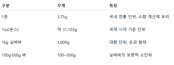 1돈은 정확히 3.75g, 1kg 실버바는 1,000g이며, 이 둘은 단위만 다를 뿐 기준 은함량(순도)에 따라 가격 구조가 동일합니다.