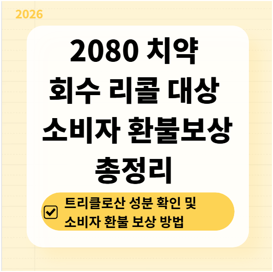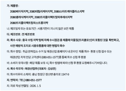 안녕하세요! 우리 가족의 건강을 위해 매일 사용하는 생필품에서 안전성 문제가 불거지면 걱정이 앞서기 마련입니다. 최근 2080 치약 중 일부 제품이 성분 문제로 인해 회수(리콜) 결정이 내려졌다는 소식이 전해졌습니다.